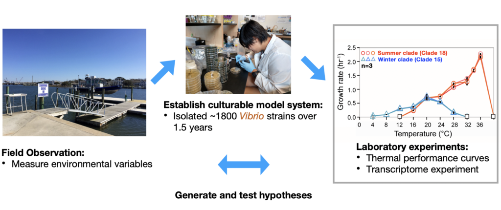 My early studies explored thermal adaptation in marine bacteria – Vibrios through a combination of strain-level population studies, growth rate experiments, genomics, transcriptomics, and fine-scale spatial community studies. I have found that closely-related vibrio strains observed under a range of temperature conditions exhibited thermal specialization at very fine-scale phylogenetic resolution. To follow up, I looked at how these closely-related strains regulate their genes to cope with different thermal stresses.