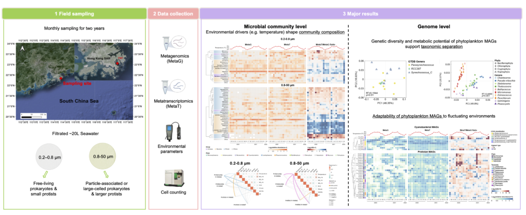 Our research explores the dynamic world of marine microbes across diverse ocean ecosystems using cutting-edge molecular techniques. We employ a comprehensive approach, including metagenomics, metatranscriptomics, long-read sequencing, Hi-C sequencing, and single-cell genomics, to study the entire spectrum of marine microbial life – from prokaryotes and eukaryotic microbes to viruses – and their complex interactions. Our work focuses on understanding microbial community changes as a whole, examining how these communities shift and adapt over time and across different ocean regions. We investigate both temporal and spatial dynamics, as well as the impact of anthropogenic activities on these microbial ecosystems. By integrating data from our advanced techniques, we’re creating a high-resolution, multi-dimensional picture of marine microbial communities. This research provides crucial insights into ocean food webs, global nutrient cycles, and the response of microbial communities to environmental changes and human influences.